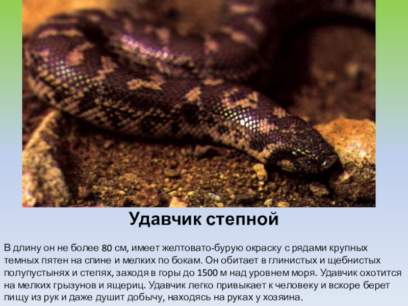 с рядами крупных темных пятен на спине и мелких по бокам. Он обитает в глинистых и щебнистых полупустынях и степях, заходя в горы до 1500 м над уровнем моря. Удавчик охотится на мелких грызунов и ящериц. Удавчик легко привыкает к человеку и вскоре берет пищу из рук и даже душит добычу, находясь на руках у хозяина.