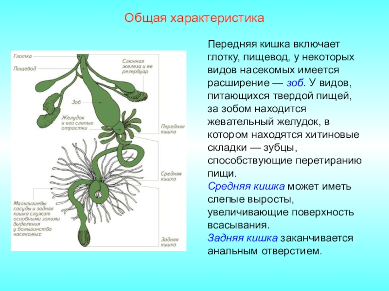 Передняя кишка включает глотку, пищевод, у некоторых видов насекомых имеется
