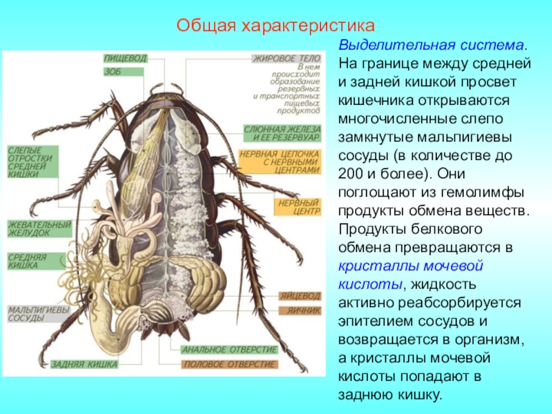 кишечника открываются многочисленные слепо замкнутые мальпигиевы сосуды (в количестве до 200 и более). Они поглощают из гемолимфы продукты обмена веществ.