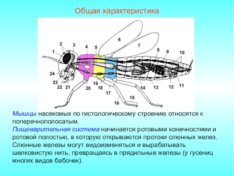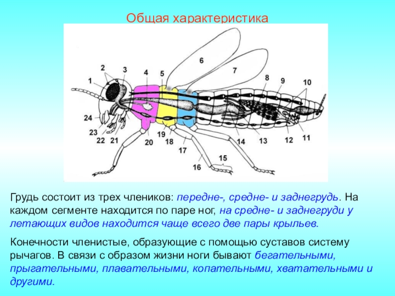 каждом сегменте находится по паре ног, на средне- и заднегруди у летающих видов находится чаще всего две пары крыльев.