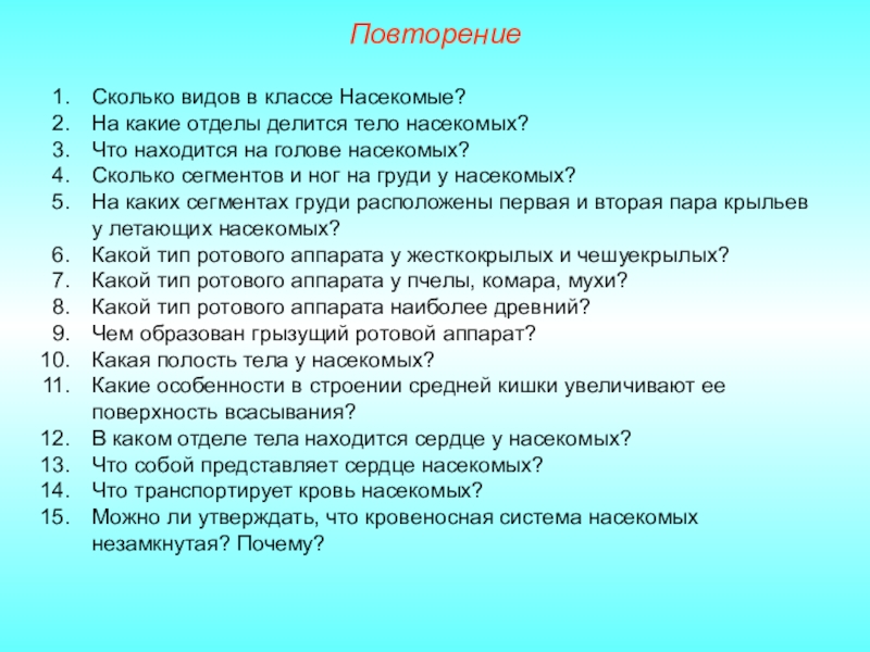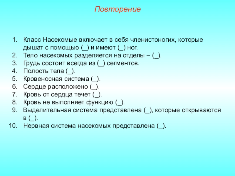 Слайд 45Класс Насекомые включает в себя членистоногих, которые дышат с помощью (_)