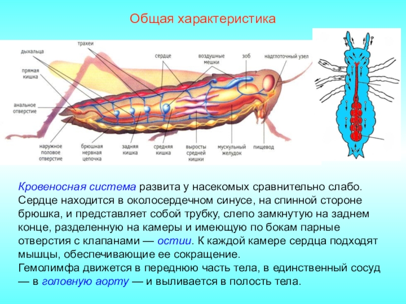 Кровеносная система развита у насекомых сравнительно слабо. Сердце находится в