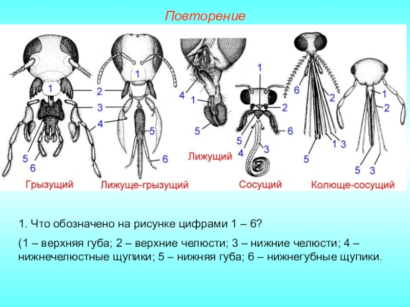 верхняя губа; 2 – верхние челюсти; 3 – нижние челюсти; 4 – нижнечелюстные щупики; 5 – нижняя губа; 6 – нижнегубные щупики.