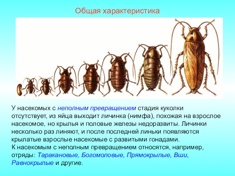 К насекомым с неполным превращением относятся, например, отряды: Таракановые, Богомоловые, Прямокрылые, Вши, Равнокрылые и другие.