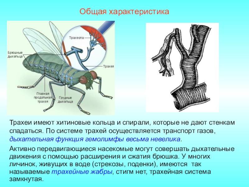 Активно передвигающиеся насекомые могут совершать дыхательные движения с помощью расширения и сжатия брюшка. У многих личинок, живущих в воде (стрекозы, поденки), имеются так называемые трахейные жабры, стигм нет, трахейная система замкнутая.