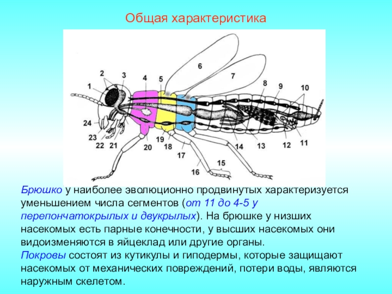 11 до 4-5 у перепончатокрылых и двукрылых). На брюшке у низших насекомых есть парные конечности, у высших насекомых они видоизменяются в яйцеклад или другие органы.