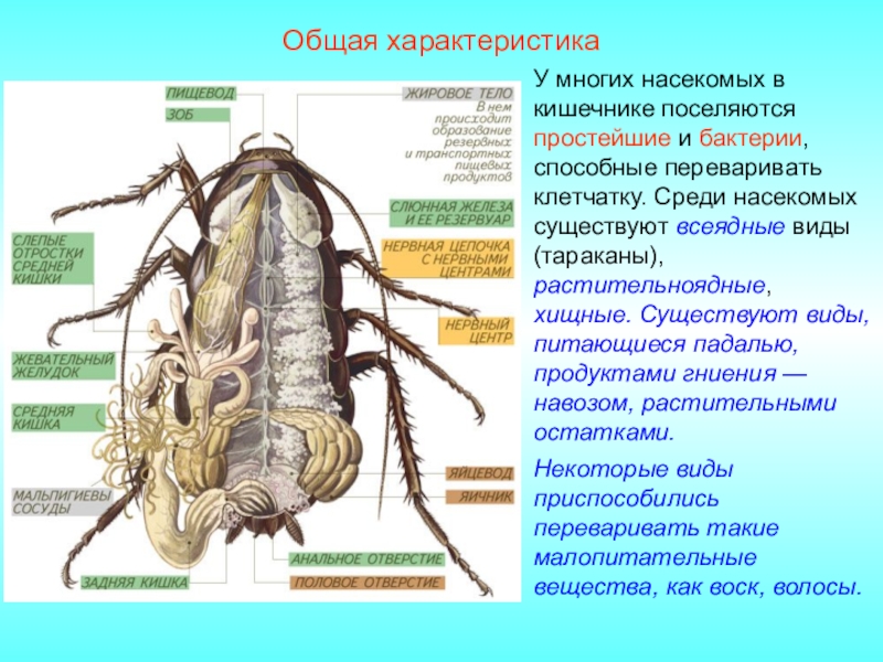переваривать клетчатку. Среди насекомых существуют всеядные виды (тараканы), растительноядные, хищные. Существуют виды, питающиеся падалью, продуктами гниения — навозом, растительными остатками.
