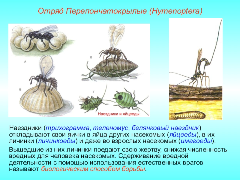 яйца других насекомых (яйцееды), в их личинки (личинкоеды) и даже во взрослых насекомых (имагоеды).
