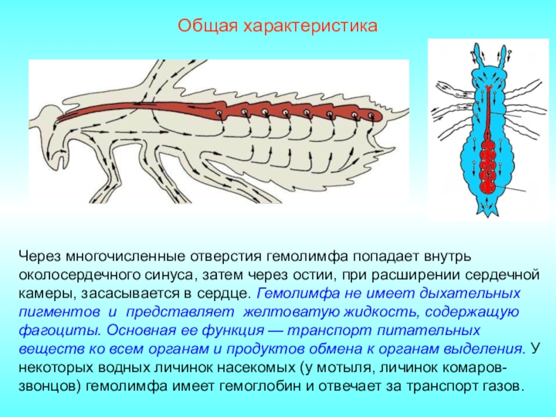 остии, при расширении сердечной камеры, засасывается в сердце. Гемолимфа не имеет дыхательных пигментов и представляет желтоватую жидкость, содержащую фагоциты. Основная ее функция — транспорт питательных веществ ко всем органам и продуктов обмена к органам выделения. У некоторых водных личинок насекомых (у мотыля, личинок комаров-звонцов) гемолимфа имеет гемоглобин и отвечает за транспорт газов.
