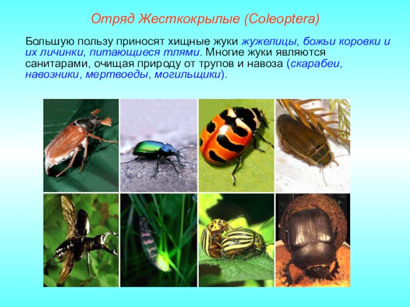 их личинки, питающиеся тлями. Многие жуки являются санитарами, очищая природу от трупов и навоза (скарабеи, навозники, мертвоеды, могильщики).