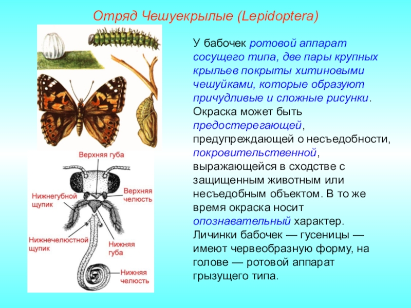 Личинки бабочек — гусеницы — имеют червеобразную форму, на голове — ротовой аппарат грызущего типа.