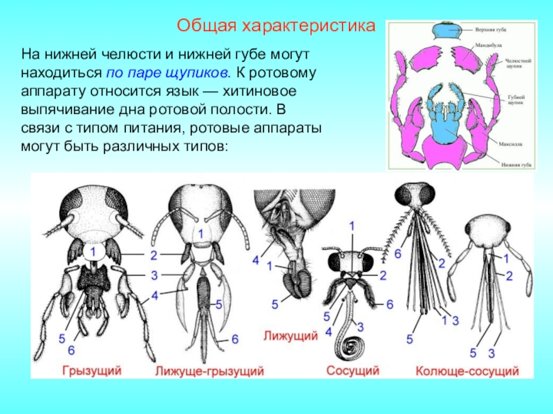 щупиков. К ротовому аппарату относится язык — хитиновое выпячивание дна ротовой полости. В связи с типом питания, ротовые аппараты могут быть различных типов: