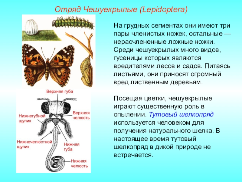 остальные — нерасчлененные ложные ножки. Среди чешуекрылых много видов, гусеницы которых являются вредителями лесов и садов. Питаясь листьями, они приносят огромный вред лиственным деревьям.