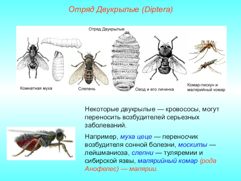 муха цеце — переносчик возбудителя сонной болезни, москиты — лейшманиоза, слепни — туляремии и сибирской язвы, малярийный комар (рода Анофелес) — малярии.