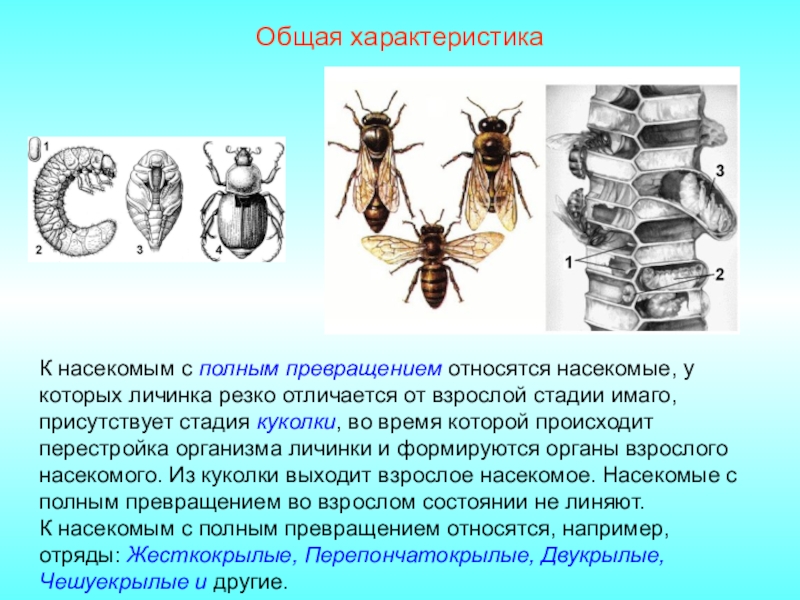 К насекомым с полным превращением относятся, например, отряды: Жесткокрылые, Перепончатокрылые, Двукрылые, Чешуекрылые и другие.