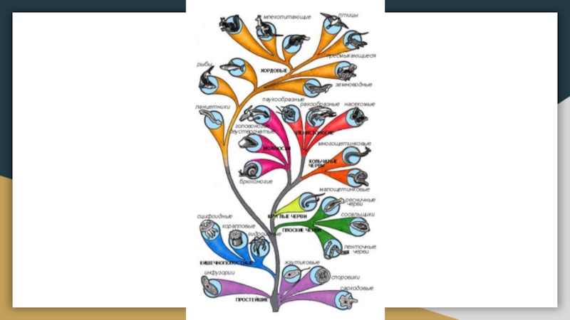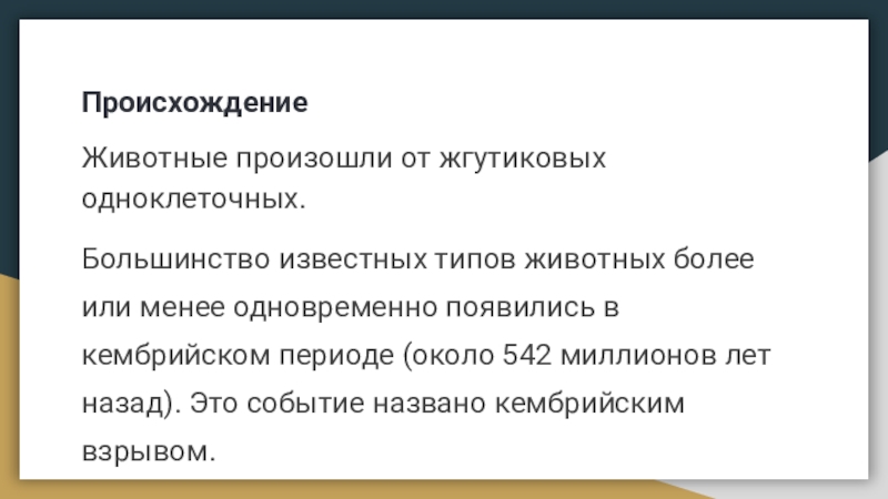 ПроисхождениеЖивотные произошли от жгутиковых одноклеточных.Большинство известных типов животных более или менее одновременно появились в кембрийском периоде (около
