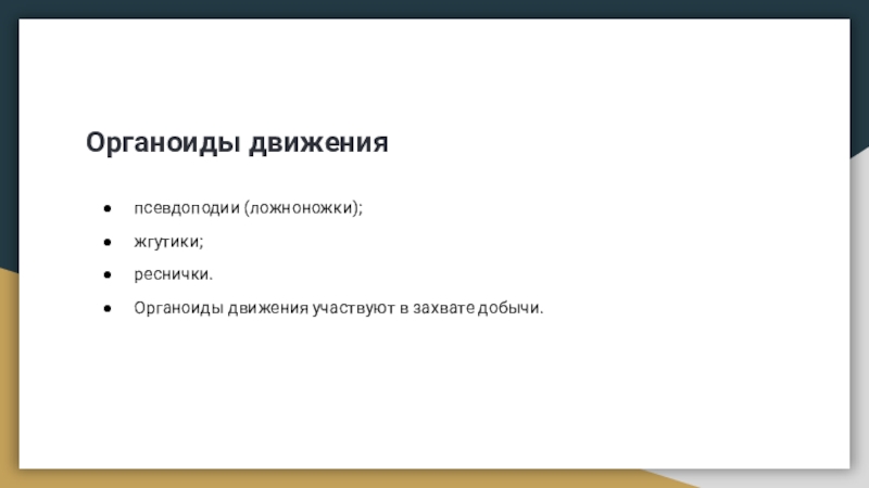 Органоиды движенияпсевдоподии (ложноножки);жгутики;реснички.Органоиды движения участвуют в захвате добычи.