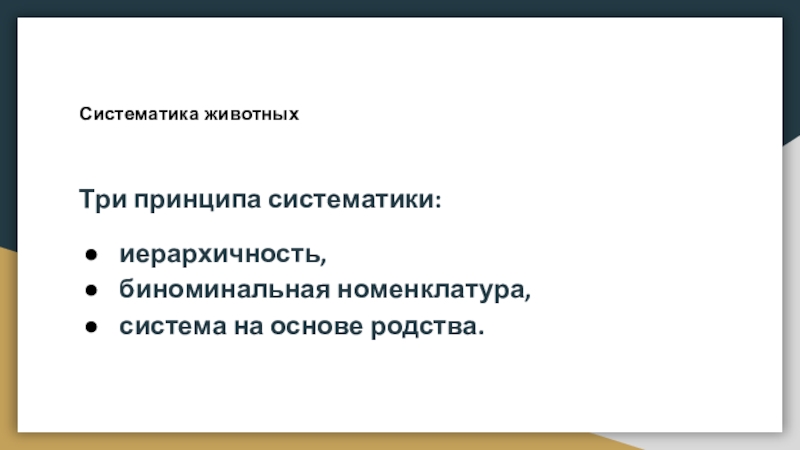 Систематика животныхТри принципа систематики:иерархичность,биноминальная номенклатура,система на основе родства.