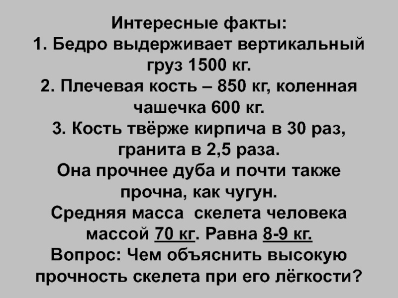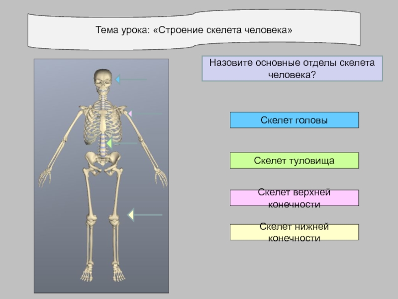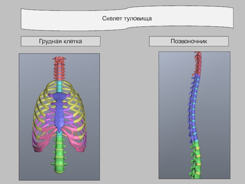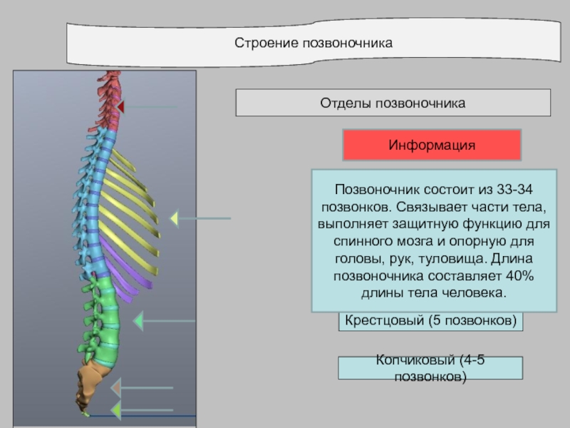 Позвоночник состоит из 33-34 позвонков. Связывает части тела, выполняет защитную функцию для спинного мозга и опорную для головы, рук, туловища. Длина позвоночника составляет 40% длины тела человека.