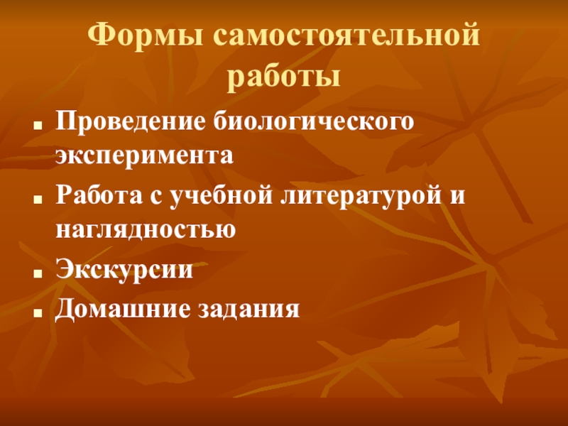 Формы самостоятельной работыПроведение биологического экспериментаРабота с учебной литературой и наглядностьюЭкскурсииДомашние задания