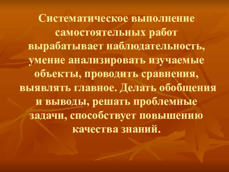 Слайд 10Систематическое выполнение самостоятельных работ вырабатывает наблюдательность, умение анализировать изучаемые объекты, проводить