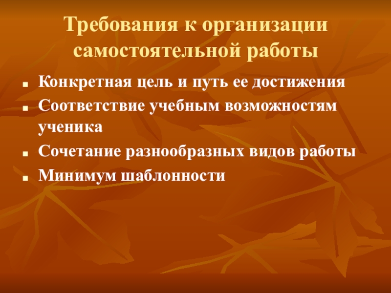 Требования к организации самостоятельной работыКонкретная цель и путь ее достиженияСоответствие учебным возможностям ученикаСочетание разнообразных видов работыМинимум шаблонности