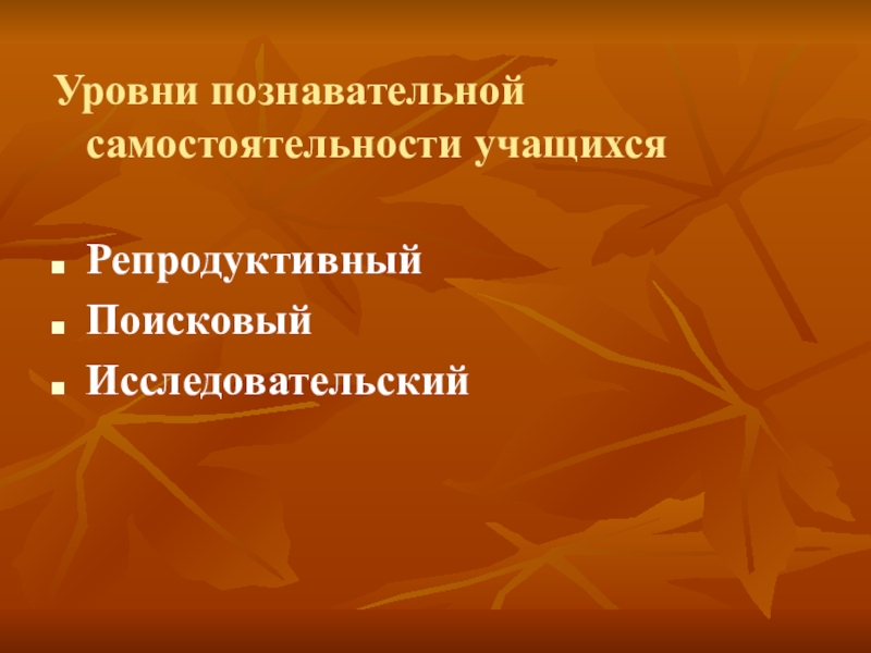 Уровни познавательной самостоятельности учащихсяРепродуктивныйПоисковыйИсследовательский