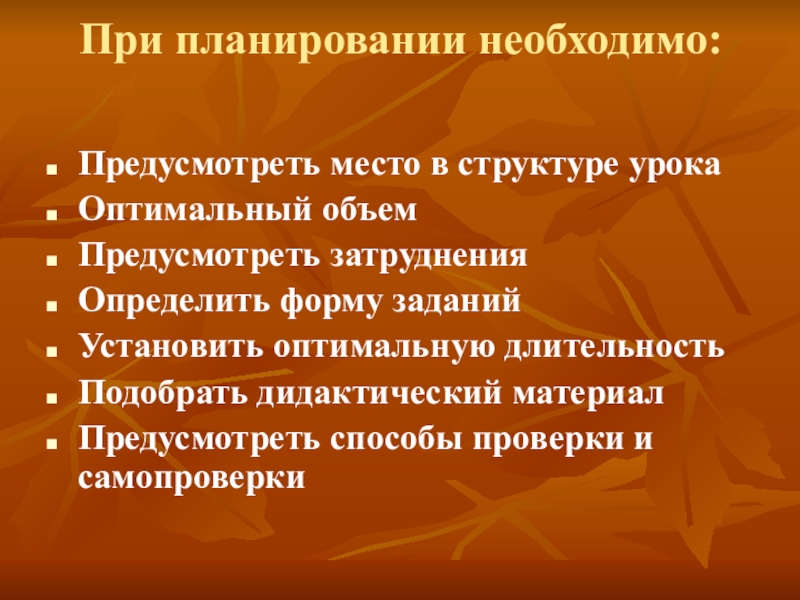 При планировании необходимо: Предусмотреть место в структуре урокаОптимальный объемПредусмотреть затрудненияОпределить форму заданийУстановить оптимальную длительностьПодобрать дидактический материалПредусмотреть способы