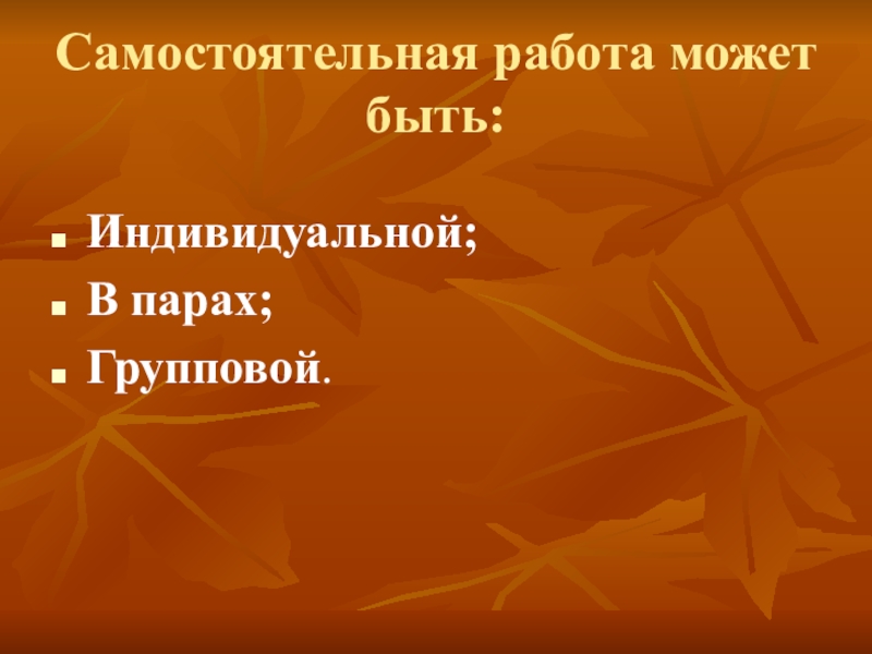 Самостоятельная работа может быть:Индивидуальной;В парах;Групповой.