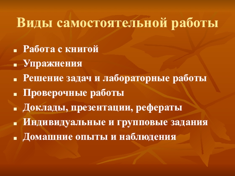 Виды самостоятельной работыРабота с книгойУпражненияРешение задач и лабораторные работыПроверочные работыДоклады, презентации, рефератыИндивидуальные и групповые заданияДомашние опыты и