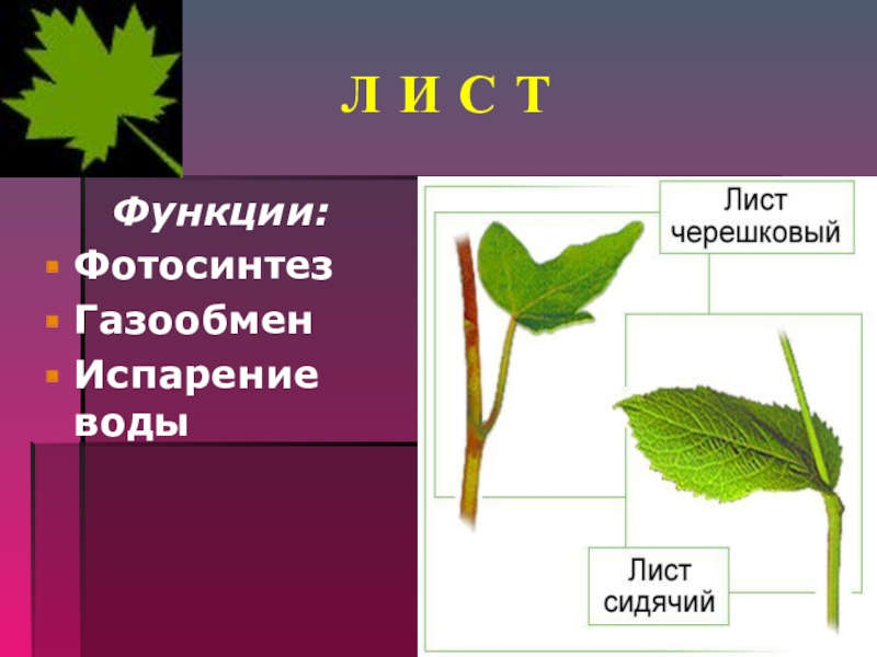 Л И С ТФункции:ФотосинтезГазообменИспарение воды