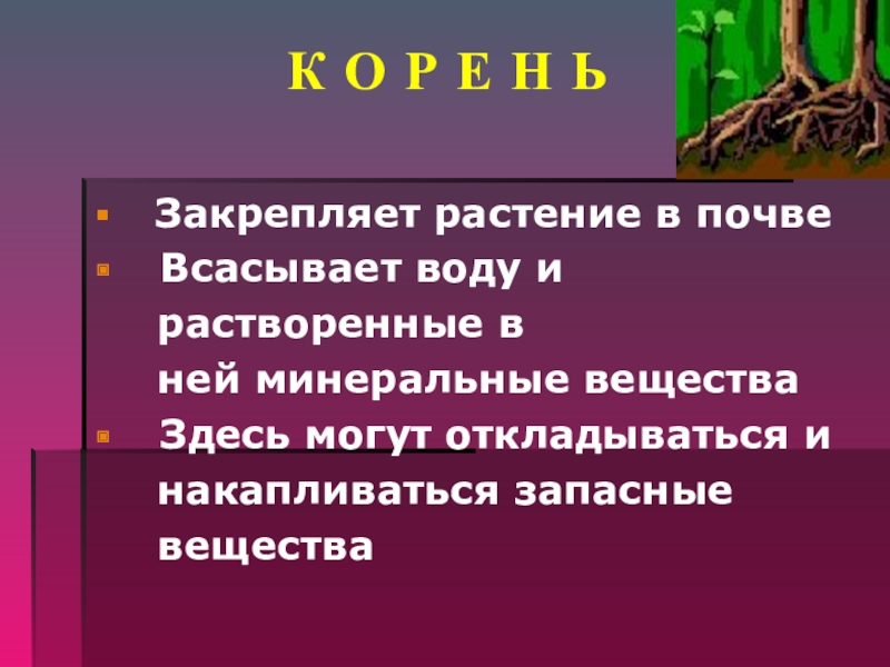 К О Р Е Н Ь Закрепляет растение в почве Всасывает воду и   растворенные в