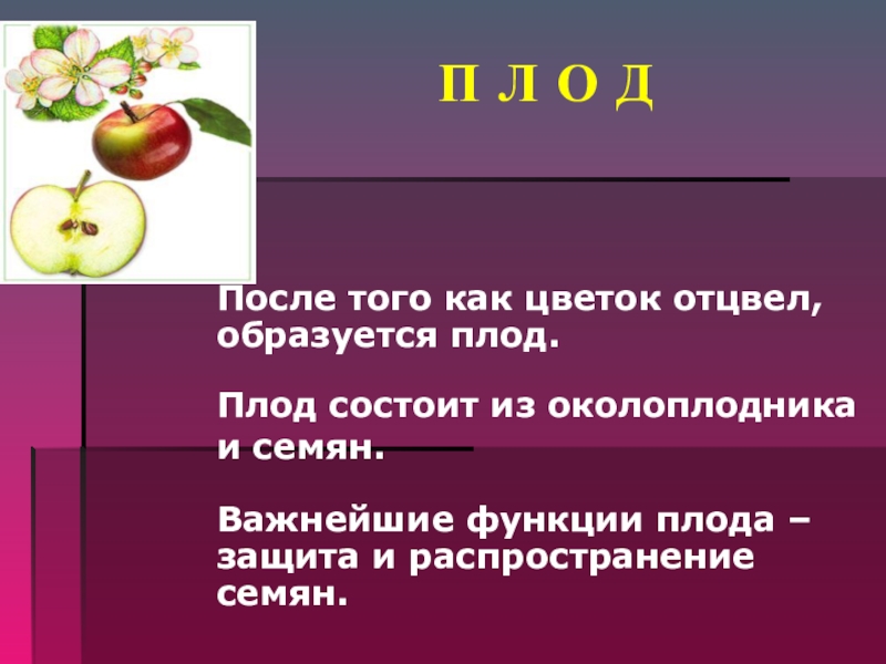 П Л О ДПосле того как цветок отцвел, образуется плод.Плод состоит из околоплодника и семян.Важнейшие функции плода