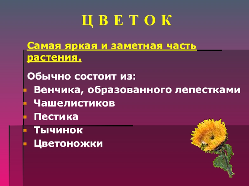 Ц В Е Т О КСамая яркая и заметная часть растения.Обычно состоит из: Венчика, образованного лепестками Чашелистиков