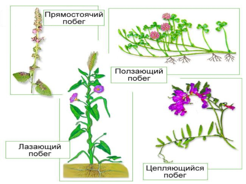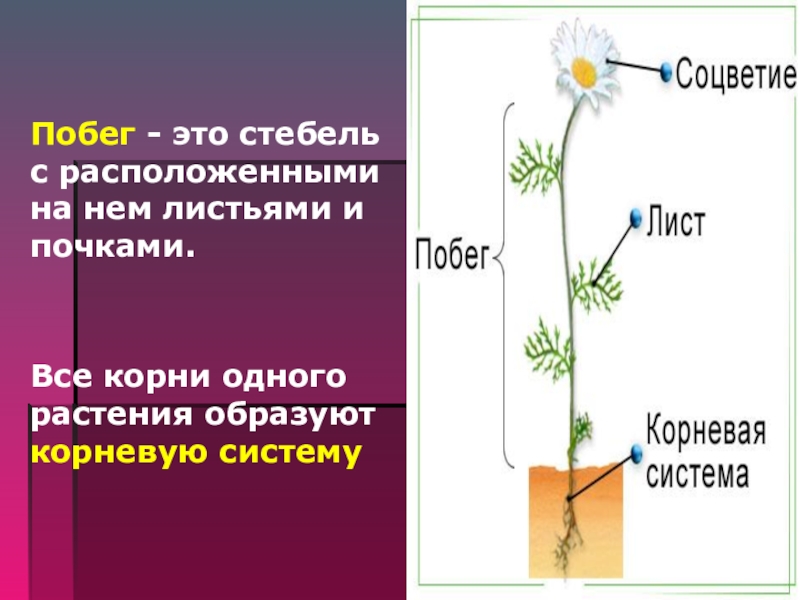 Побег - это стебель с расположенными на нем листьями и почками.Все корни одного растения образуют корневую систему