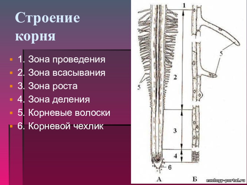 Строение  корня1. Зона проведения2. Зона всасывания3. Зона роста4. Зона деления5. Корневые волоски6. Корневой чехлик