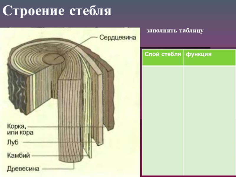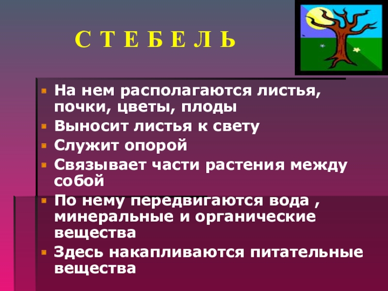 С Т Е Б Е Л ЬНа нем располагаются листья, почки, цветы, плодыВыносит листья к светуСлужит опоройСвязывает