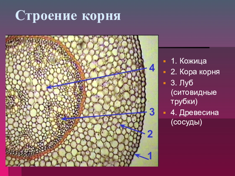 Строение корня1. Кожица2. Кора корня3. Луб (ситовидные трубки)4. Древесина (сосуды)1234
