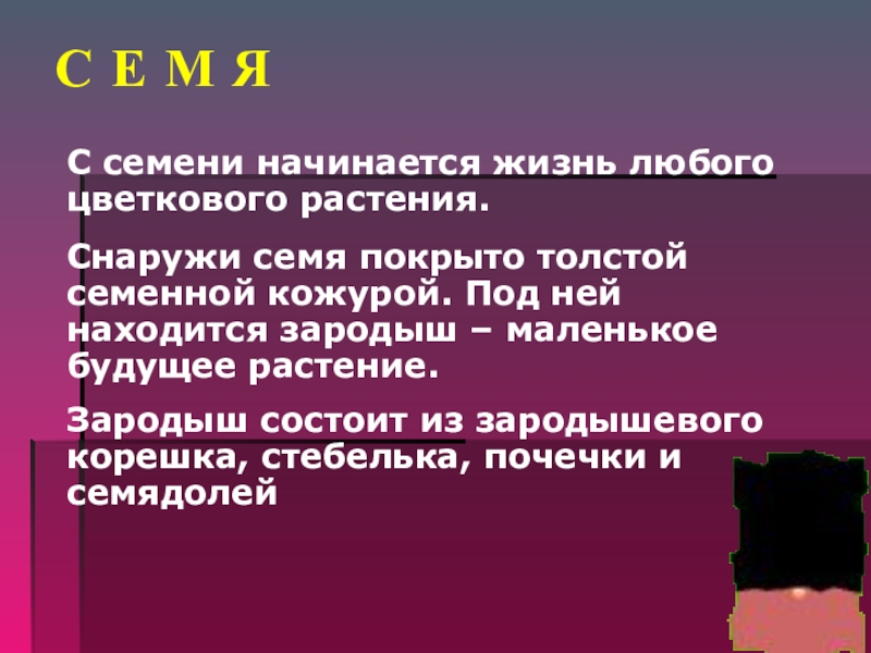 С Е М ЯС семени начинается жизнь любого цветкового растения. Снаружи семя покрыто толстой семенной кожурой. Под
