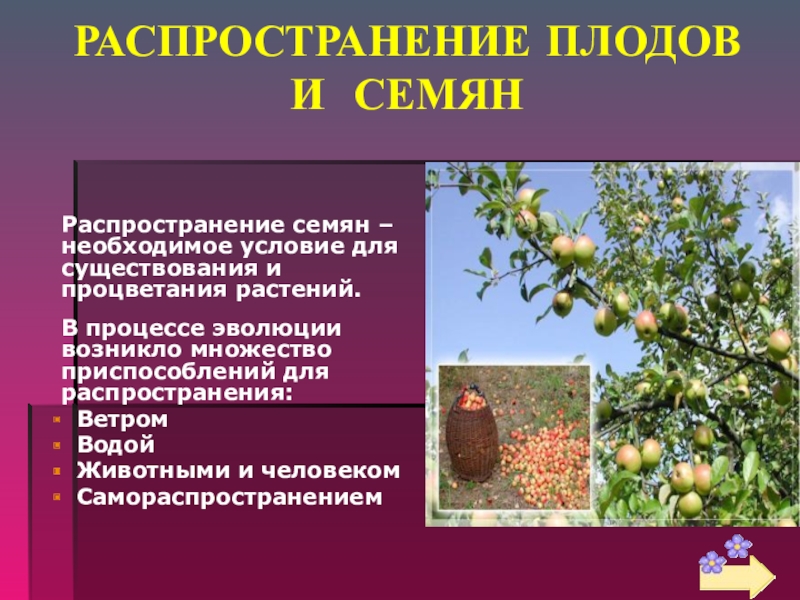 РАСПРОСТРАНЕНИЕ ПЛОДОВ И СЕМЯНРаспространение семян – необходимое условие для существования и процветания растений.В процессе эволюции возникло множество