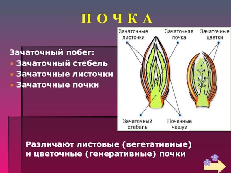 П О Ч К АЗачаточный побег:Зачаточный стебельЗачаточные листочкиЗачаточные почкиРазличают листовые (вегетативные)и цветочные (генеративные) почки