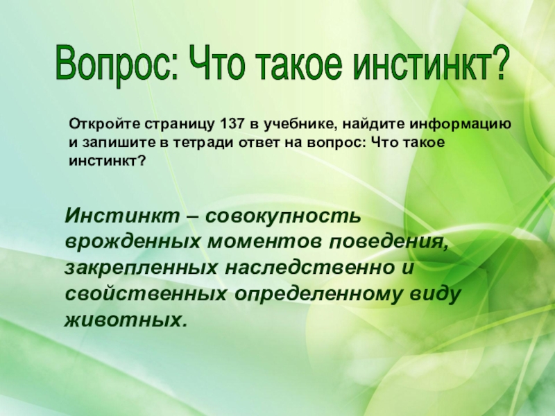 Инстинкт – совокупность врожденных моментов поведения, закрепленных наследственно и свойственных определенному виду животных.