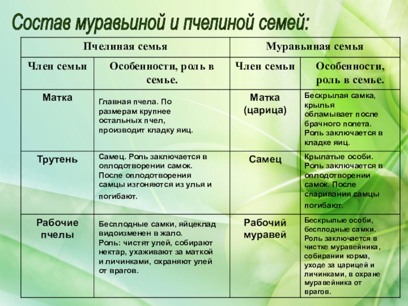 Роль: чистят улей, собирают нектар, ухаживают за маткой и личинками, охраняют улей от врагов.