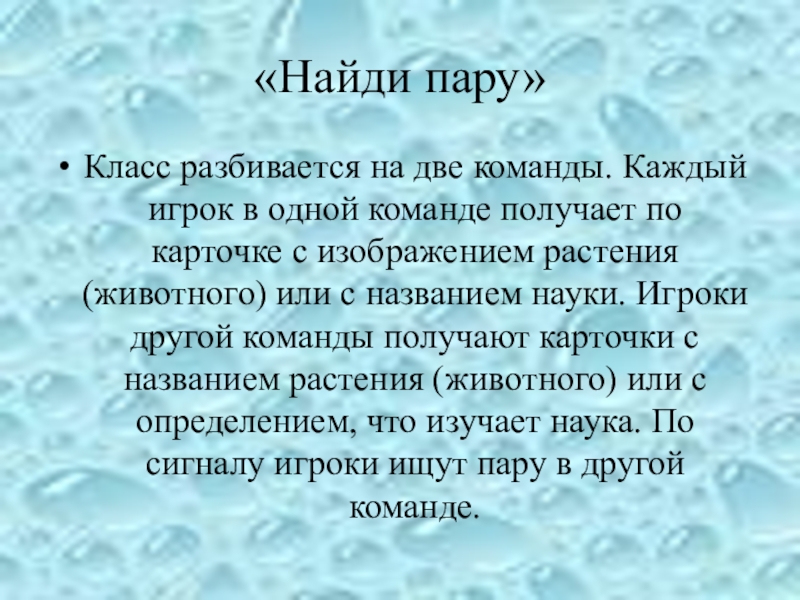 получает по карточке с изображением растения (животного) или с названием науки. Игроки другой команды получают карточки с названием растения (животного) или с определением, что изучает наука. По сигналу игроки ищут пару в другой команде.