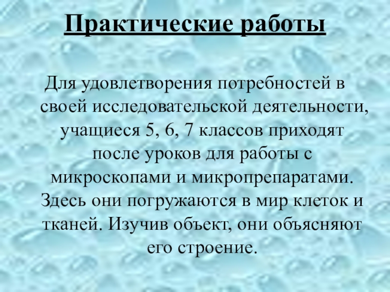 7 классов приходят после уроков для работы с микроскопами и микропрепаратами. Здесь они погружаются в мир клеток и тканей. Изучив объект, они объясняют его строение.