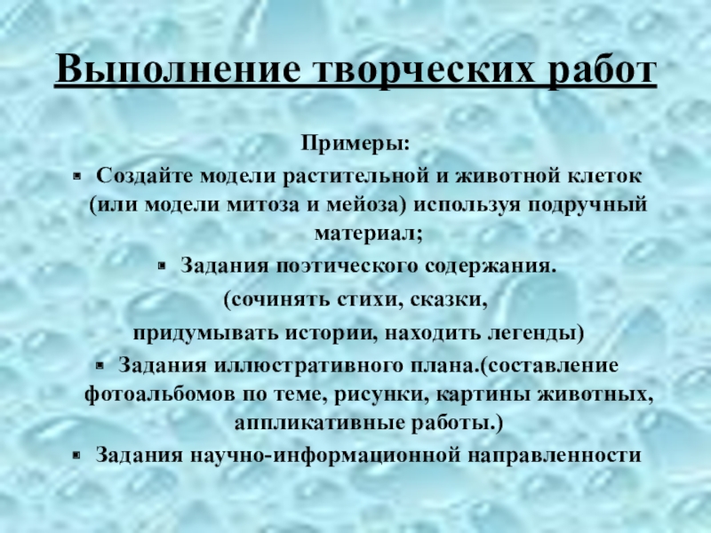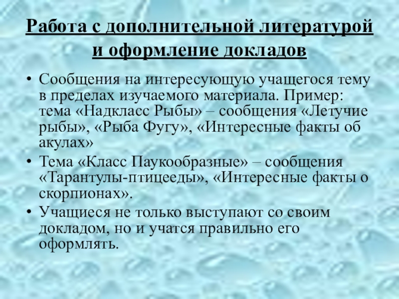 в пределах изучаемого материала. Пример: тема «Надкласс Рыбы» – сообщения «Летучие рыбы», «Рыба Фугу», «Интересные факты об акулах»