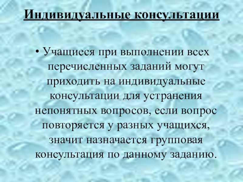 консультации для устранения непонятных вопросов, если вопрос повторяется у разных учащихся, значит назначается групповая консультация по данному заданию.
