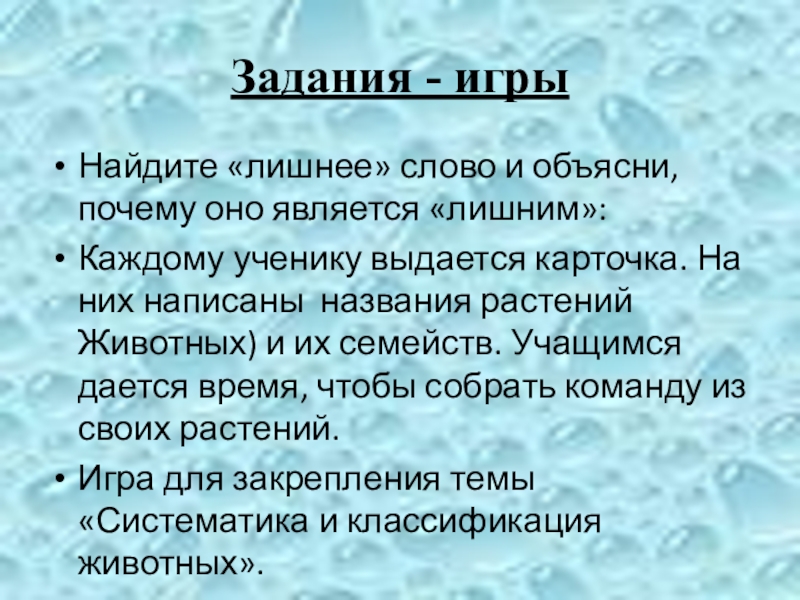 ученику выдается карточка. На них написаны названия растений Животных) и их семейств. Учащимся дается время, чтобы собрать команду из своих растений.