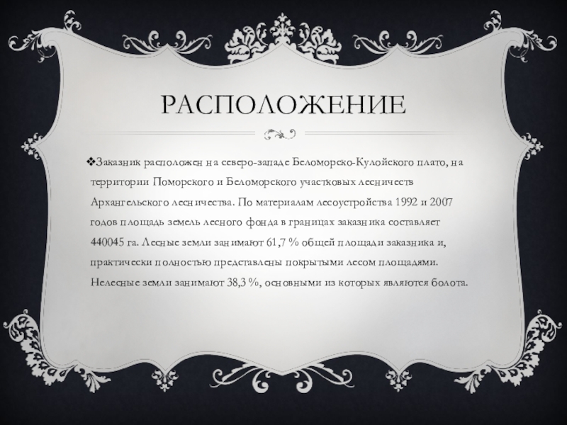 расположениеЗаказник расположен на северо-западе Беломорско-Кулойского плато, на территории Поморского и Беломорского участковых лесничеств Архангельского лесничества. По материалам лесоустройства 1992 и 2007 годов площадь земель лесного фонда в границах заказника составляет 440045 га. Лесные земли занимают 61,7