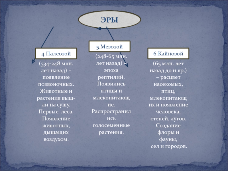 (248-65 млн. лет назад) – эпоха рептилий. Появились птицы и млекопитающие. Распространились голосеменные растения.